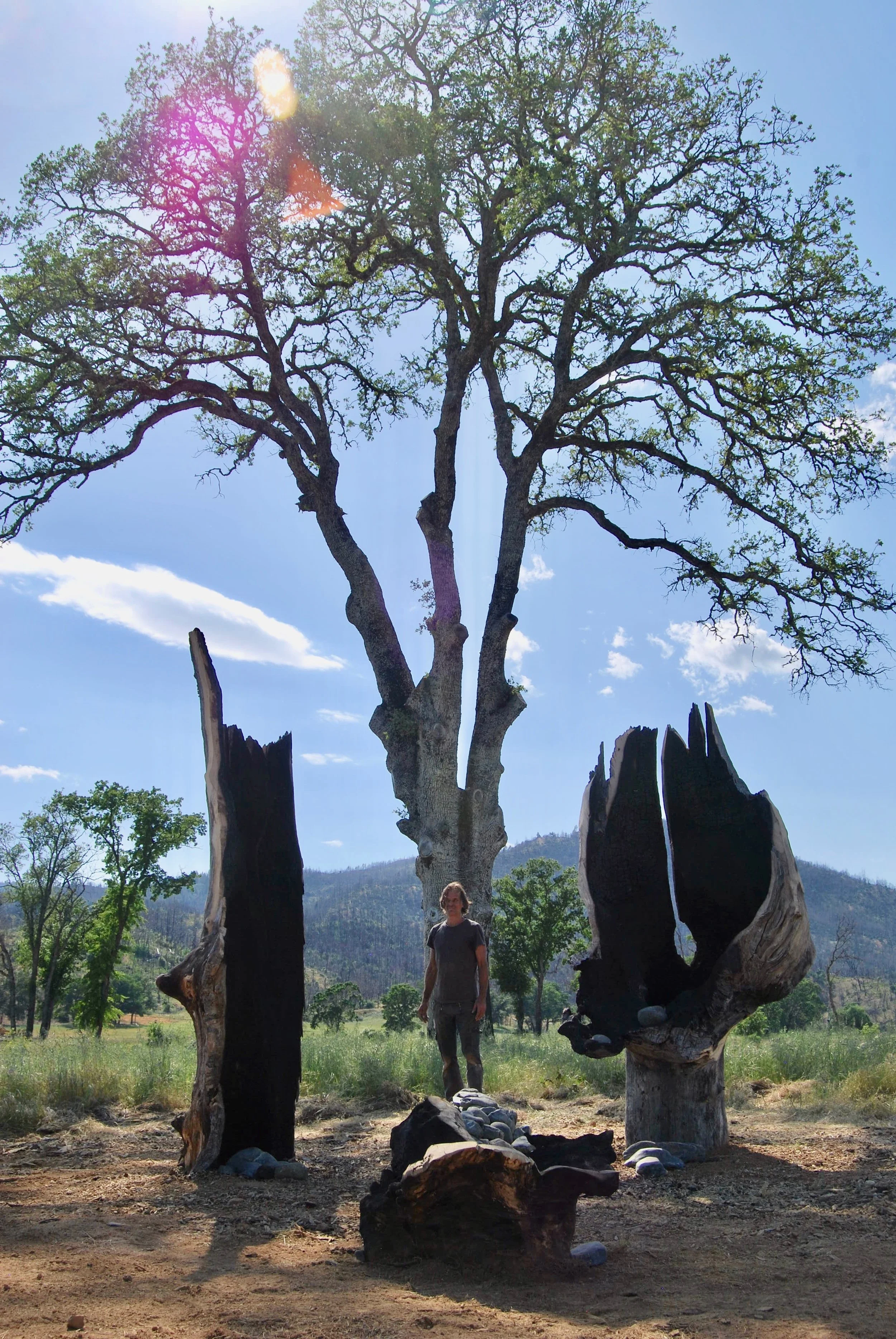 This installation, created from the remains of an ancient Oak Tree, invites remembrance and gratitude for the beings and trees that inhabited this land. In giving attention to the scarred and wounded landscapes of our planet we invite nature to receive our sincere apologies, so healing can occur for humans and the natural world. Celebrating and shaping a future that is sustainable and rooted in a co-creative partnership with nature is the essence of this art piece.